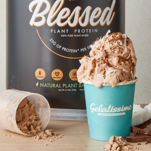 - Gelatissimo Choc Coconut Protein. Blessed Protein Powder. Image supplied.