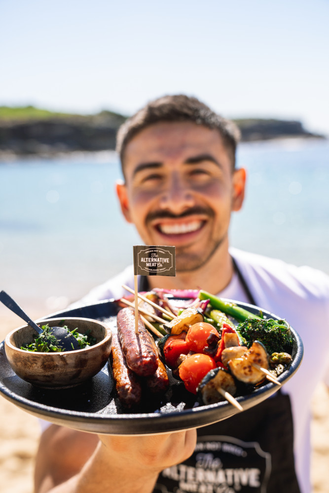 - Jono Castano with his plant-based plate of barbecued Alternative Meat Co. sausages. Image: Supplied