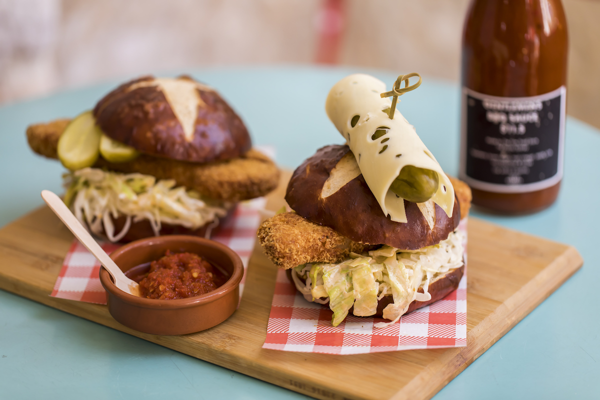- German Pretzel Burger by The Fine Food Store. Photographed by Anna Kucera. Image supplied