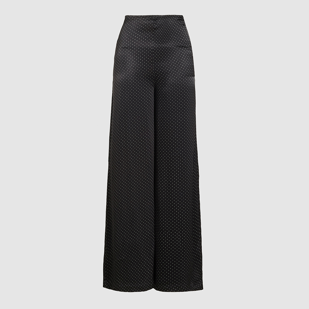 - Ganni black polka dot wide-leg trousers. Image via The Luxury Closet.