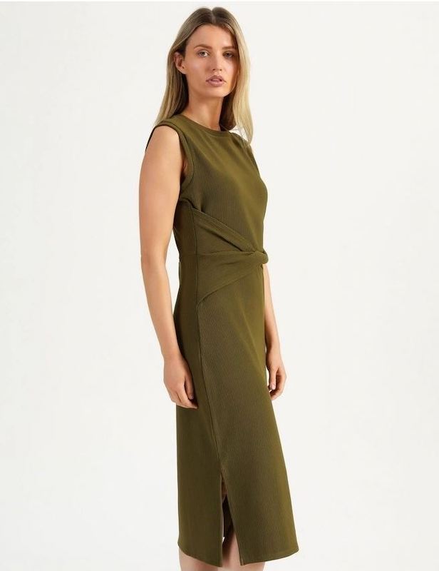 - Basque. Twist Bodice Ribbed Jersey Dress Military Olive. Image supplied.