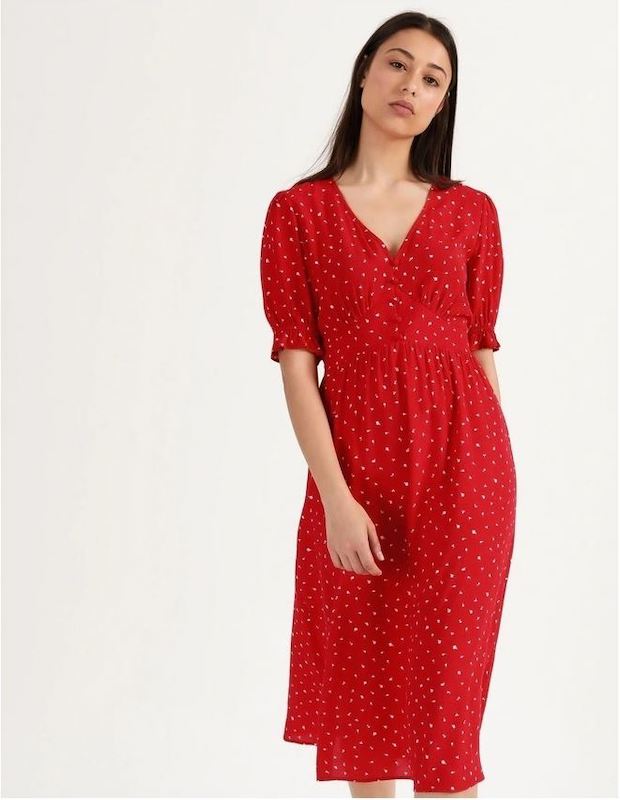 - Tokito. Puff Sleeve Midi Tea Dress Ruby Ditsy. Image supplied.