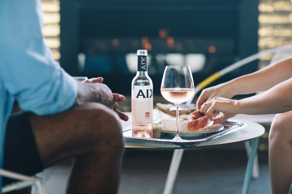 - Drinks on the outdoor terrace with golden fireplace in background. Image: Supplied