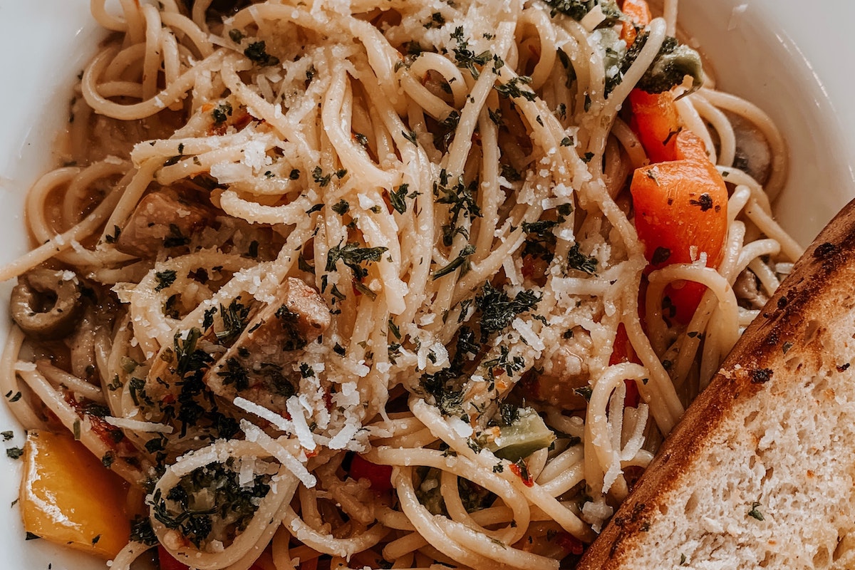 - Spaghetti with bread. Photographed by Mahima Agarwal. Image via Unsplash