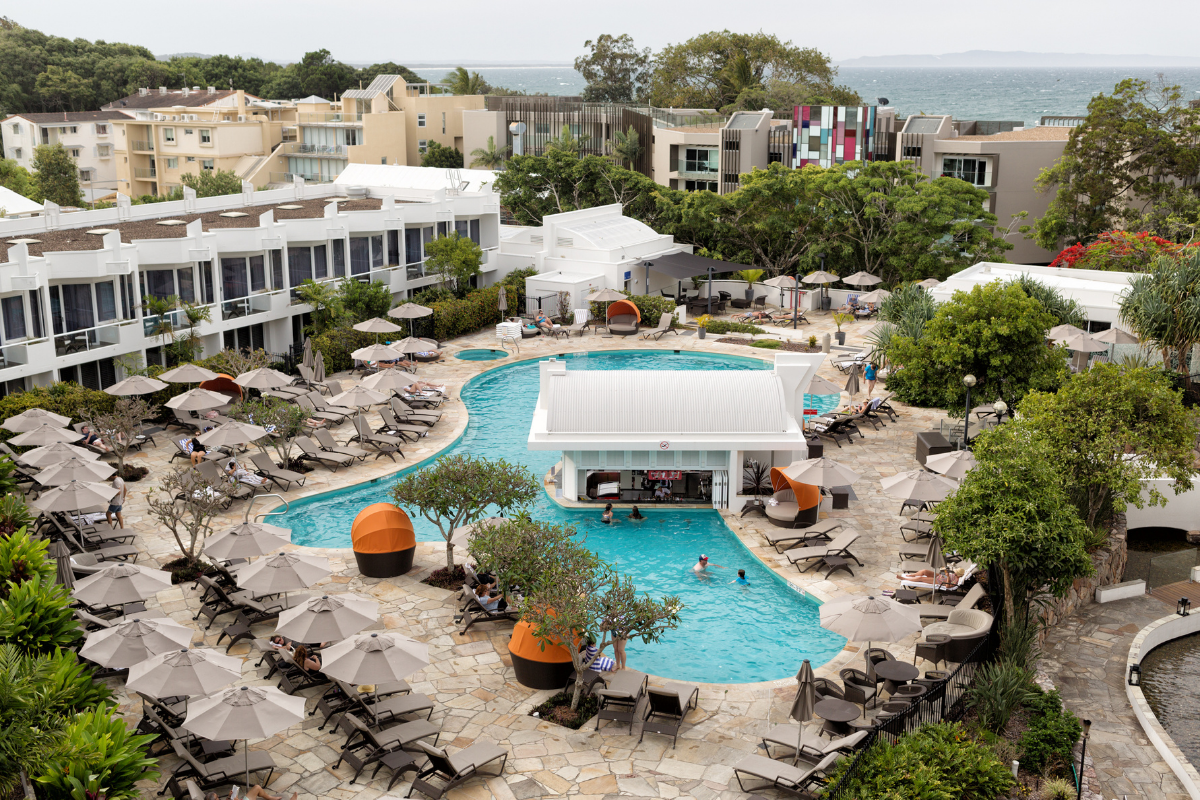 - View from a balcony overlooking the pool at Sofitel Noosa Pacific Resort in Noosa Heads, Noosa, Queensland. Photographed by Steve Lovegrove. Image supplied via Shutterstock.