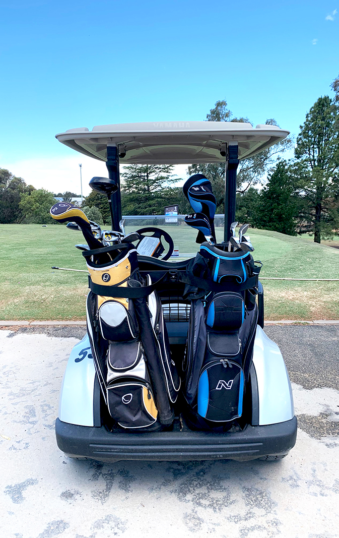 - Cobram Golf Club, The Murray. Golf clubs and cart. Image via Rebecca Cherote for Hunter and Bligh