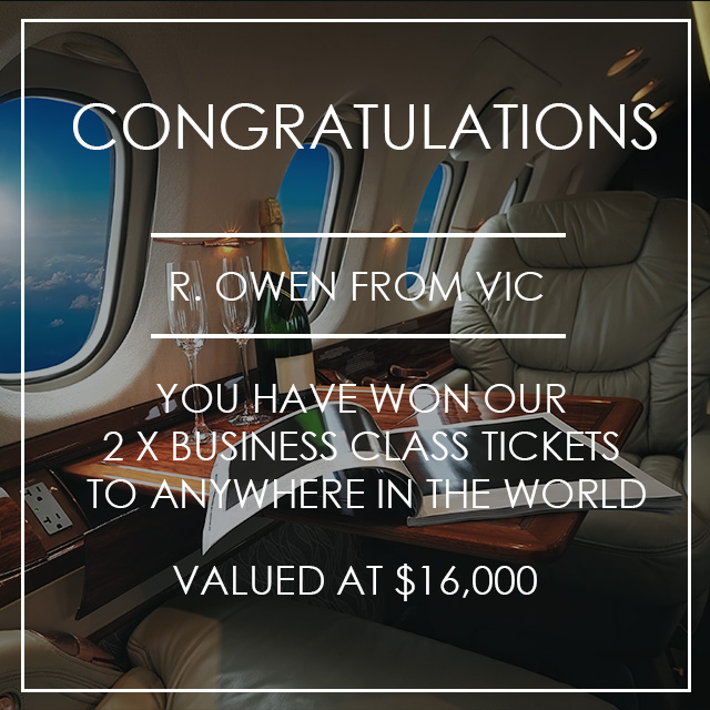 - Business Class Trip: R.Owen VIC. Valued at $16,000